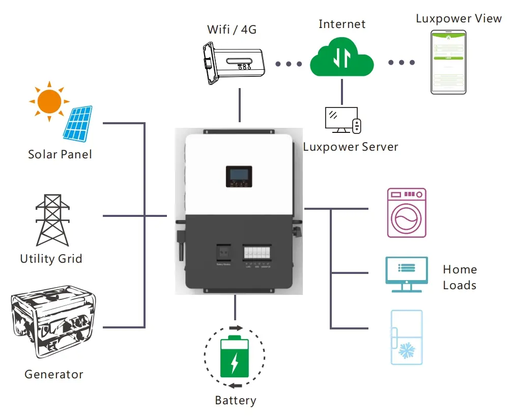 Раскрывая новое измерение, инвертор Luxpower SNA US 6000 не ограничивается только использованием сетки; Он также предлагает автономную выработку электроэнергии для подачи питания в сочетании с сетью. Эта двойная способность обслуживает регионы с различными условиями питания, что позволяет плавно переходить между режимами подключенной к сети и без сети. Это делает его идеальным решением для удаленных областей и мест с нестабильным источником питания, что позволяет прямому использованию вне сети.